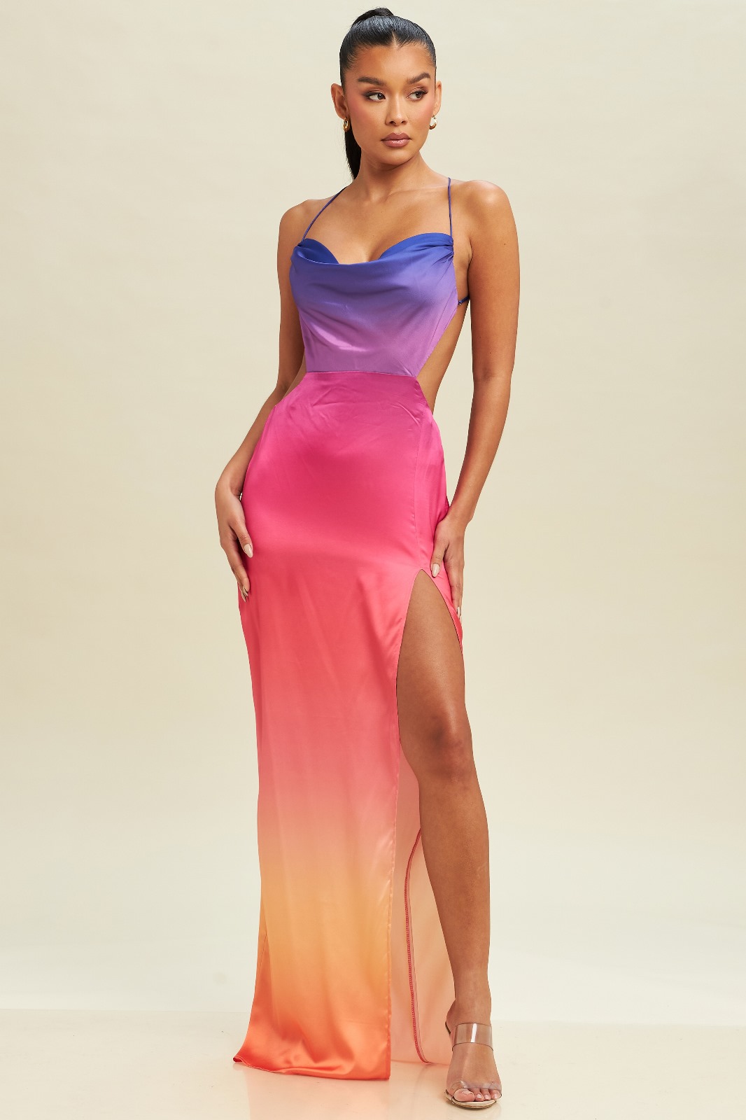 Satin halter sin espalda drapeado nudo costado abertura en pierna
