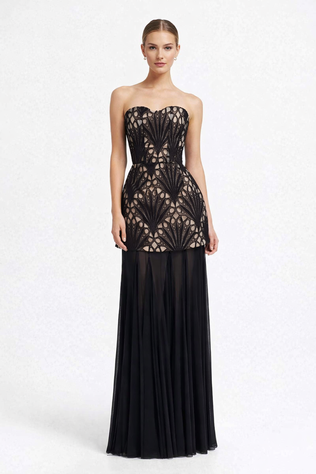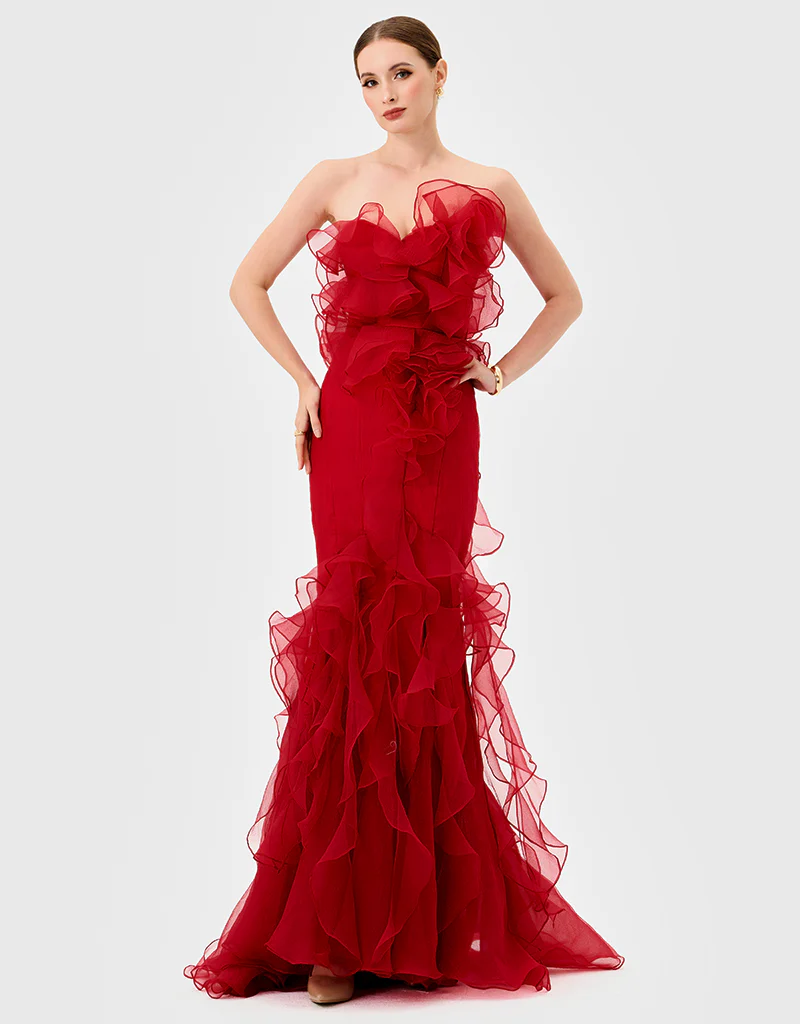 Strapless escote corazón organza pierna abierta